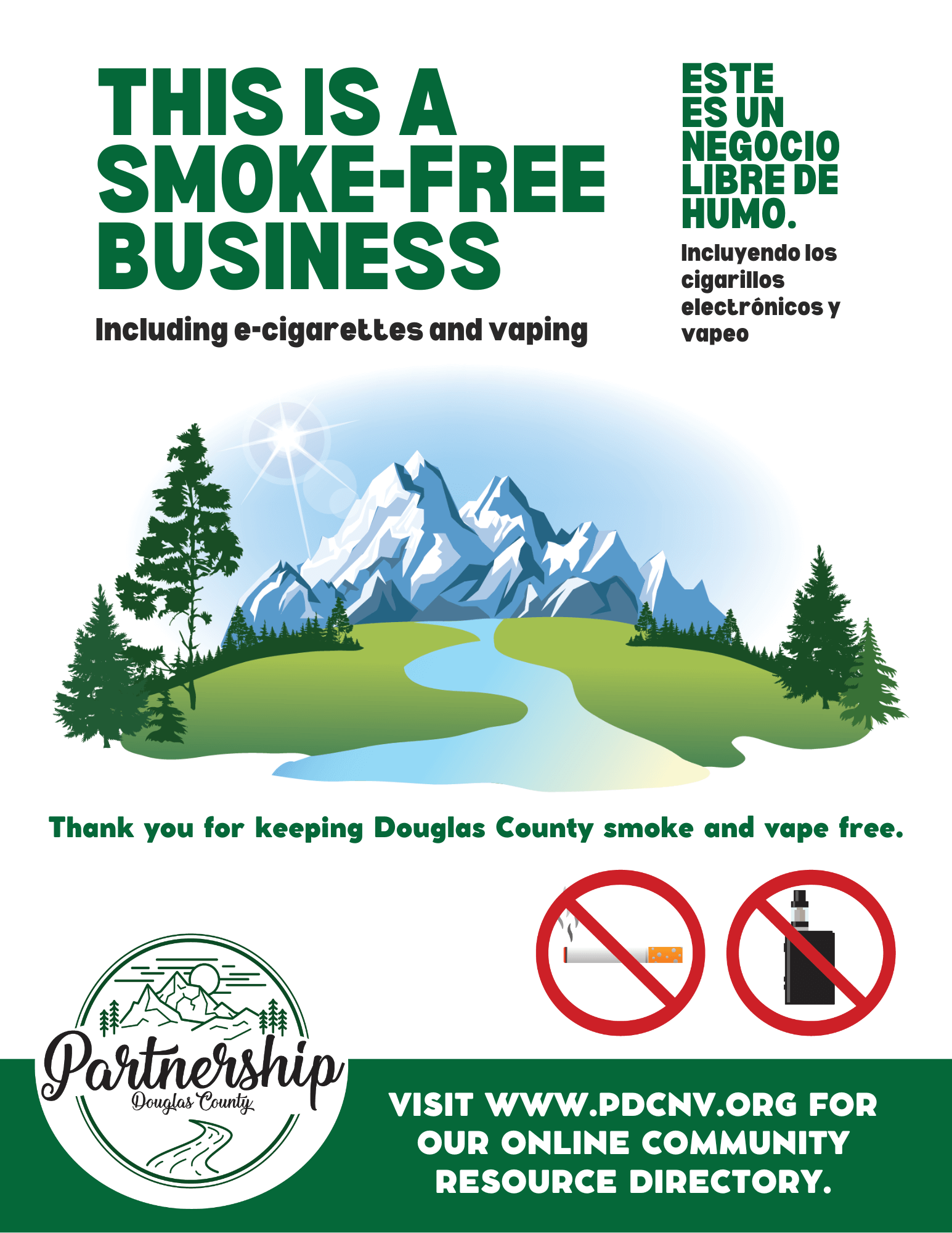 Using the design for our Smoke-Free Events signs we created a Smoke-Free Business window cling and provided this to over 200 businesses. With leveraged funding PDC aims to provide signage to all county offices and businesses registered with the Carson Valley Chamber of Commerce and Tahoe Chamber.